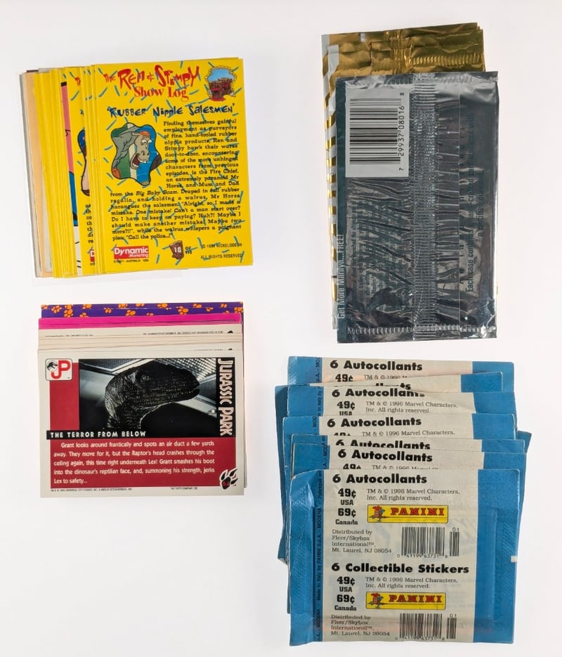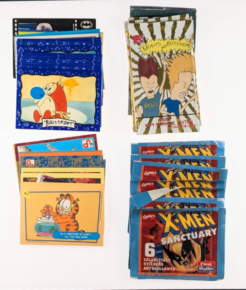 COLLECTION OF VINTAGE POP CULTURE STICKERS AND TRADING CARD PACKS FROM THE EARLY 1990S.Item Size: Height: 5cm, Width: 5cm, Depth: 5cm, Weight: 0.5KgComprehensive Collection Of Vintage 1990S Collectible Trading Cards And Sticker Packs Featuring Iconic Comic And Cartoon Franchises. Includes Batman-Themed Card Set, Beavis And Butt-Head Merchandise, Garfield Sticker Collection, X-Men Sanctuary Sticker Packs By Fleer Skybox, Ren & Stimpy Show Log Cards By Dynamic, And Marvel Comics Autocollant/Sticker Packs By Panini. Mixed Condition Lot With Original Packaging, Some Sealed And Unopened Items. Represents Popular Pop Culture Ephemera From The EarCondition: Fair - Refer To ImagesFC163119+41