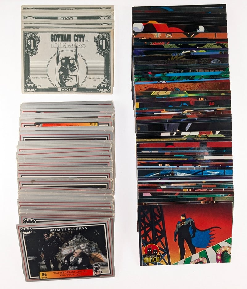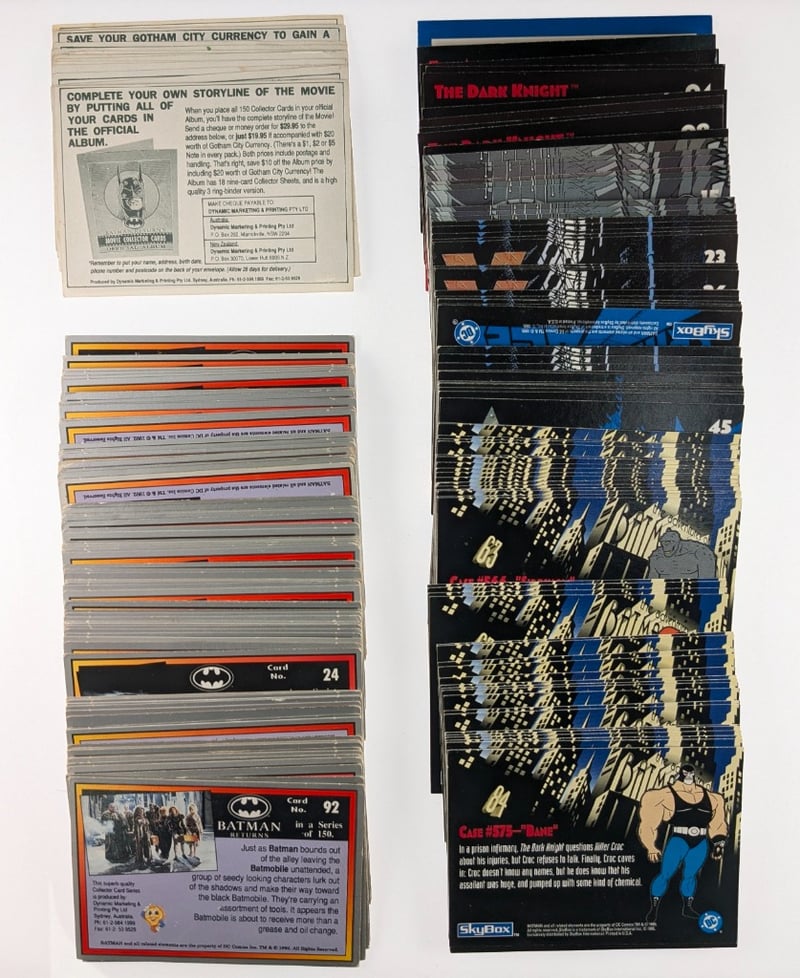 VINTAGE BATMAN TRADING CARD COLLECTION (1989-1992)Item Size: Height: 5cm, Width: 5cm, Depth: 5cm, Weight: 0.5KgComprehensive Batman Trading Card Collection Spanning 1989-1992, Featuring Topps Batman Returns Series And The Dark Knight Trading Cards. Collection Includes Approximately 150+ Cards In Varying Conditions, With Notable Items Including Gotham City Currency $1 Promotional Card, Batman Returns Cards (Card #86 Visible), And The Dark Knight Series Cards (#23, #45 Visible). Includes Original Album/Binder Materials And Promotional Inserts. Cards Display Vibrant Artwork Depicting Batman Characters, ScenCondition: Good - Refer To ImagesFC163119+43
