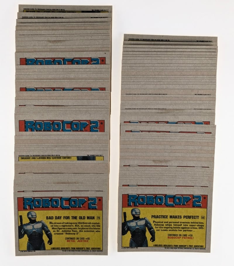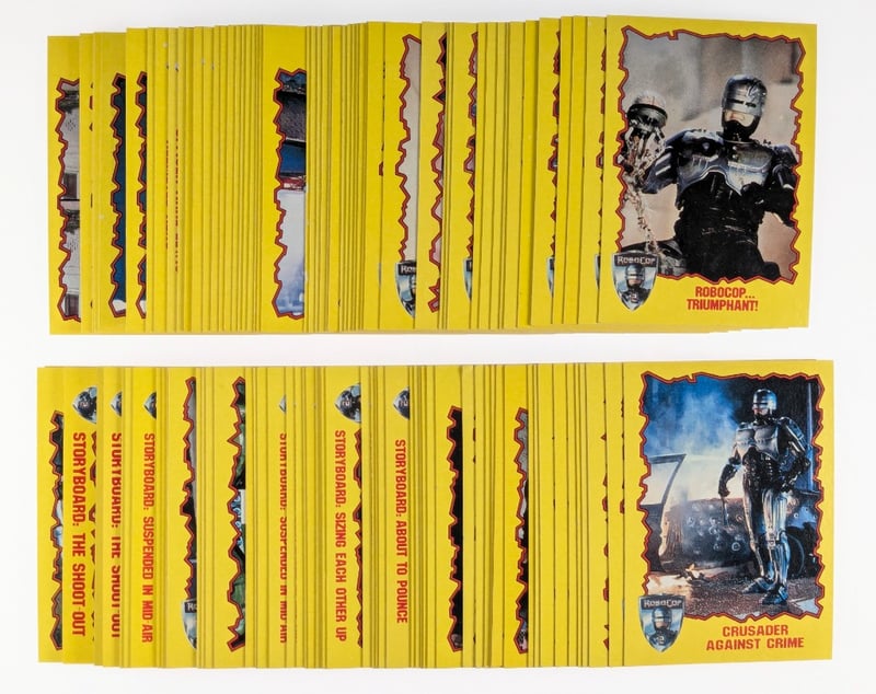 ROBOCOP TRADING CARD COLLECTION - 1980S TOPPS SERIESItem Size: Height: 5cm, Width: 5cm, Depth: 5cm, Weight: 0.5KgComprehensive Vintage Trading Card Collection Featuring Robocop And Robocop 2 From The 1980S Topps Series. Lot Includes Approximately 50+ Yellow-Bordered Cards Depicting Scenes And Characters From Both Films, With Titles Including "Robocop...Triumphant!" And "Crusader Against Crime." Also Features Stacks Of Uncut Card Sheets And Individual Cards Showing Robocop In Various Action Sequences. Cards Display Characteristic 1980S Graphic Design With Red And Blue Accents On Yellow Backgrounds. IncludesCondition: Fair - Refer To ImagesFC163119+48