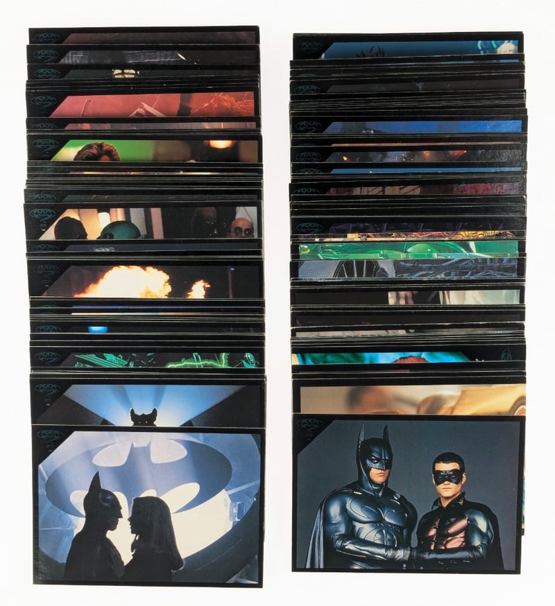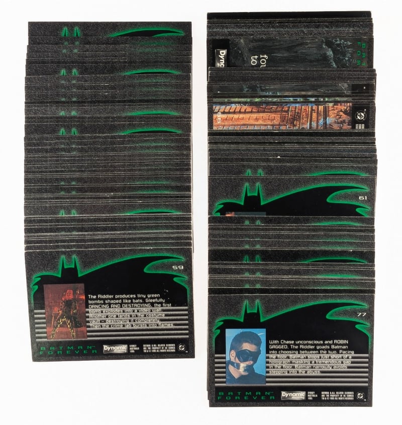 BATMAN FOREVER COMPLETE TRADING CARD SET - DYNAMIC MARKETING CORPComprehensive Collection Of Batman Forever Trading Cards From Dynamic Marketing Corp, Featuring 100+ Cards With Sequential Numbering (Visible Cards 59, 61, 77). Set Includes Character Cards Depicting Batman And Robin In Costume, Action Sequences, Riddler Villain Cards With Green Bat Logo Design, And Narrative Scene Cards From The 1995 Film. Cards Display Vibrant Colour Photography With Printed Text Descriptions Of Plot Points And Character Interactions. Black Card Stock With Embossed Green BatmaCondition: Fair - Refer To ImagesFC163119+49