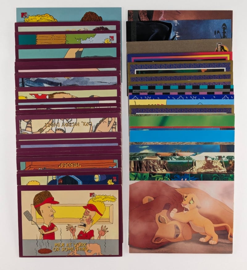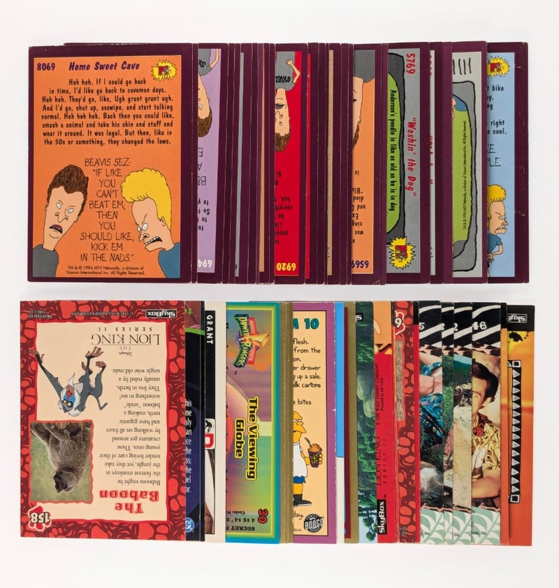 VINTAGE BEAVIS AND BUTT-HEAD TRADING CARD COLLECTION WITH PURPLE DISPLAY RACKSItem Size: Height: 5cm, Width: 5cm, Depth: 5cm, Weight: 0.5KgComprehensive Collection Of 1990S Beavis And Butt-Head Trading Cards Featuring Mtv'S Iconic Animated Duo, Housed In Two Custom-Built Purple Wooden Display Racks With Horizontal Slat Storage. Collection Includes Numbered Cards (Visible #8069, #0269, #1959), Character Cards, Episode References, And Dialogue Cards. Lower Display Features Additional Cards In Protective Sleeves And Specialty Packaging Including "The Boon" Themed Box Set. Cards Showcase Original Artwork, Character Portraits, And SerieCondition: Fair - Refer To ImagesFC163119+52