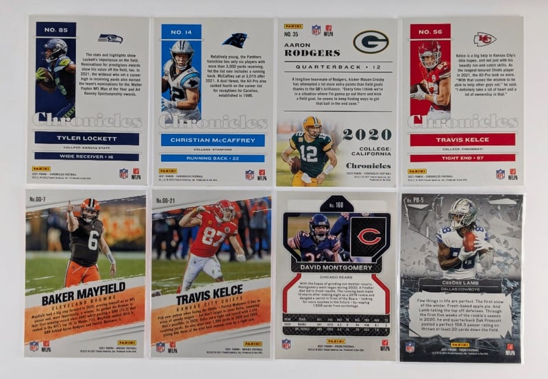 NFL TRADING CARD COLLECTION - 8 CARDS INCLUDING CHRONICLES AND PANINI RELEASESItem Size: Height: 5cm, Width: 5cm, Depth: 5cm, Weight: 0.5KgLot Of 8 Nfl Trading Cards Featuring Prominent Players Including Tyler Lockett (Seattle Seahawks), Christian Mccaffrey (Carolina Panthers), Aaron Rodgers (Green Bay Packers), Travis Kelce (Kansas City Chiefs), Baker Mayfield (Cleveland Browns), David Montgomery (Chicago Bears), And Cedee Lamb (Dallas Cowboys). Collection Includes 2020 Panini Chronicles Series Cards And Panini Prizm Releases With "Got Game?" Inserts And Specialty Finishes. Cards Display Professional Photography With Team Logos AnCondition: Good - Refer To ImagesFC163119+60