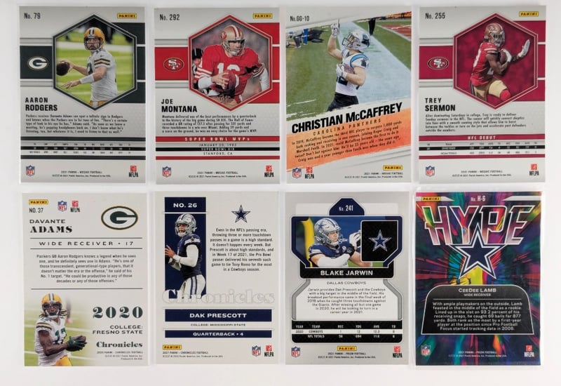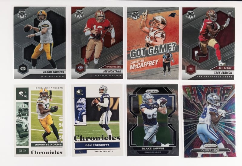 NFL TRADING CARD COLLECTION FEATURING AARON RODGERS, JOE MONTANA, CHRISTIAN MCCAFFREY, TREY SERMON, DAVANTE ADAMS, DAK PRESCOTT, BLAKE JARWIN, AND CEEDEE LAMBItem Size: Height: 5cm, Width: 5cm, Depth: 5cm, Weight: 0.5KgCurated Collection Of 8 Nfl Trading Cards Spanning Multiple Decades And Manufacturers Including Panini, Mosaic, And Prizm Brands. Features Iconic Quarterbacks Aaron Rodgers And Joe Montana Alongside Contemporary Stars Christian Mccaffrey, Dak Prescott, And Emerging Talents Trey Sermon And Ceedee Lamb. Includes Wide Receivers Davante Adams And Blake Jarwin. Cards Showcase Varied Designs With Premium Finishes Including Holographic Elements, Geometric Patterns, And Vibrant Color Schemes. Notable CaCondition: Good - Refer To ImagesFC163119+61