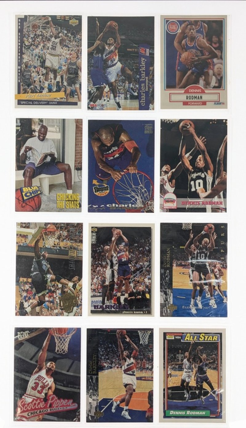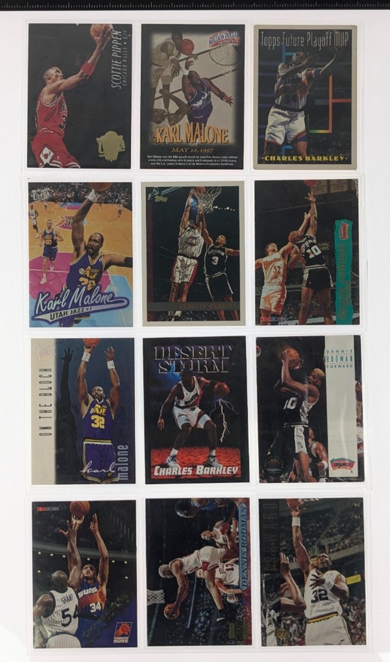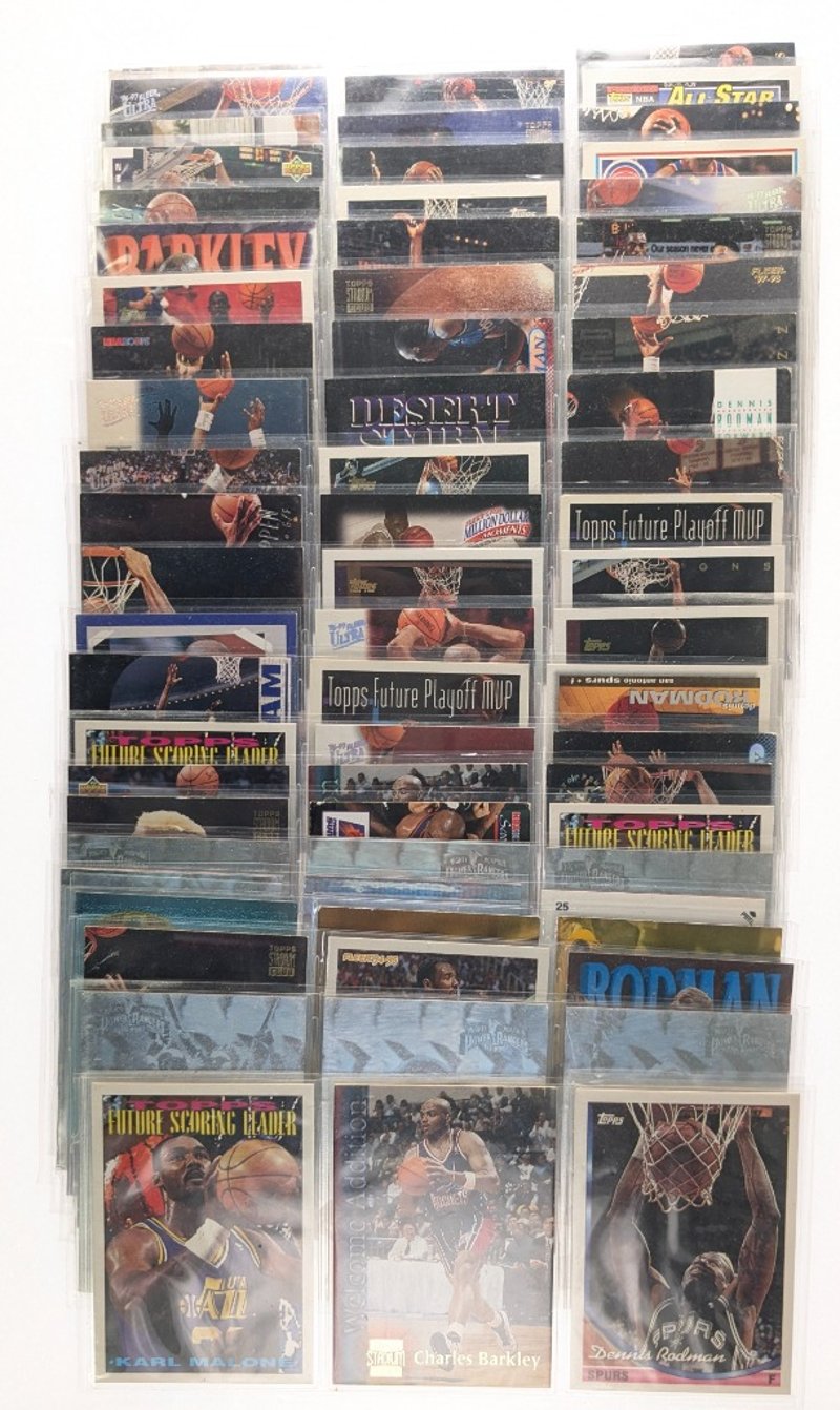 VINTAGE BASKETBALL TRADING CARD COLLECTION - 1990S NBA STARSItem Size: Height: 5cm, Width: 5cm, Depth: 5cm, Weight: 0.5KgComprehensive Collection Of Approximately 100+ Vintage Basketball Trading Cards Spanning The 1990S Era, Featuring Prominent Nba Players Including Karl Malone, Charles Barkley, Dennis Rodman, Scottie Pippen, And Michael Jordan. Cards Include Multiple Series From Topps, Upper Deck, And Fleer Manufacturers, Encompassing Standard Issues, Future Scoring Leaders Inserts, Playoff Mvp Cards, And Special Promotional Releases. Collection Displays Varying Conditions With Cards In Protective Sleeves, RepresCondition: Fair - Refer To ImagesFC163119+63