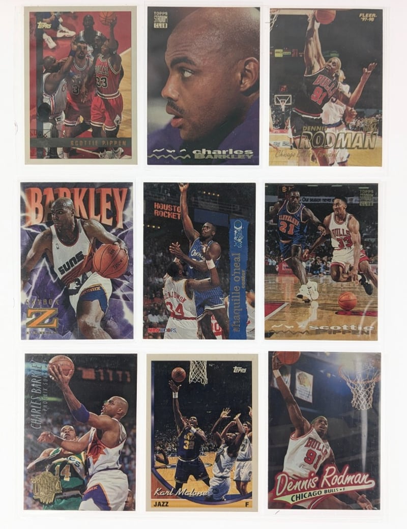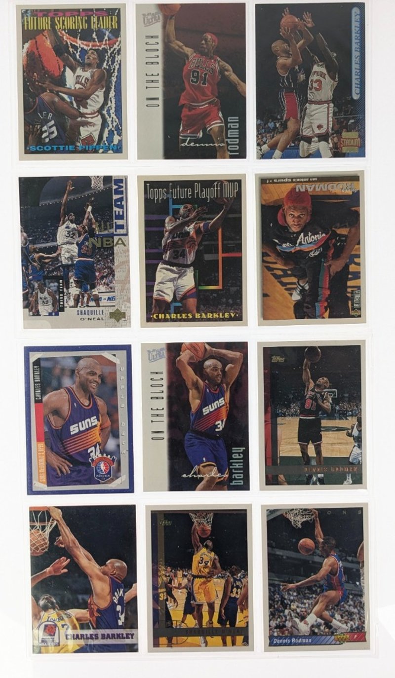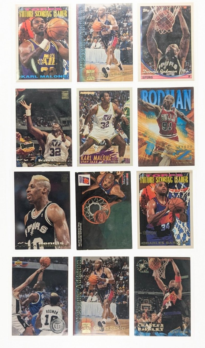 VINTAGE BASKETBALL TRADING CARD COLLECTION - 1990S NBA STARSItem Size: Height: 5cm, Width: 5cm, Depth: 5cm, Weight: 0.5KgComprehensive Collection Of Approximately 100+ Vintage Basketball Trading Cards Spanning The 1990S Era, Featuring Prominent Nba Players Including Karl Malone, Charles Barkley, Dennis Rodman, Scottie Pippen, And Michael Jordan. Cards Include Multiple Series From Topps, Upper Deck, And Fleer Manufacturers, Encompassing Standard Issues, Future Scoring Leaders Inserts, Playoff Mvp Cards, And Special Promotional Releases. Collection Displays Varying Conditions With Cards In Protective Sleeves, RepresCondition: Fair - Refer To ImagesFC163119+63