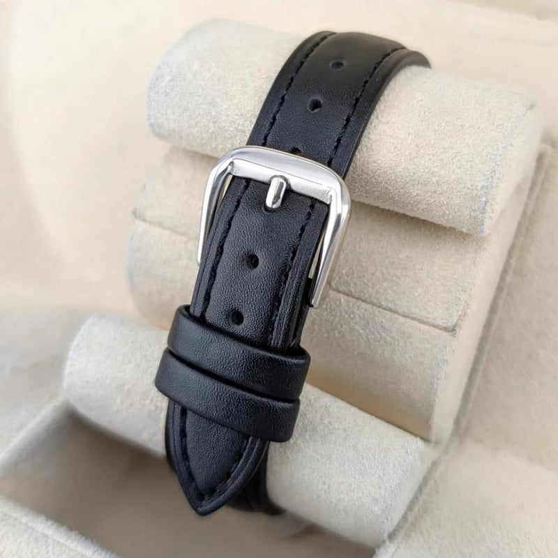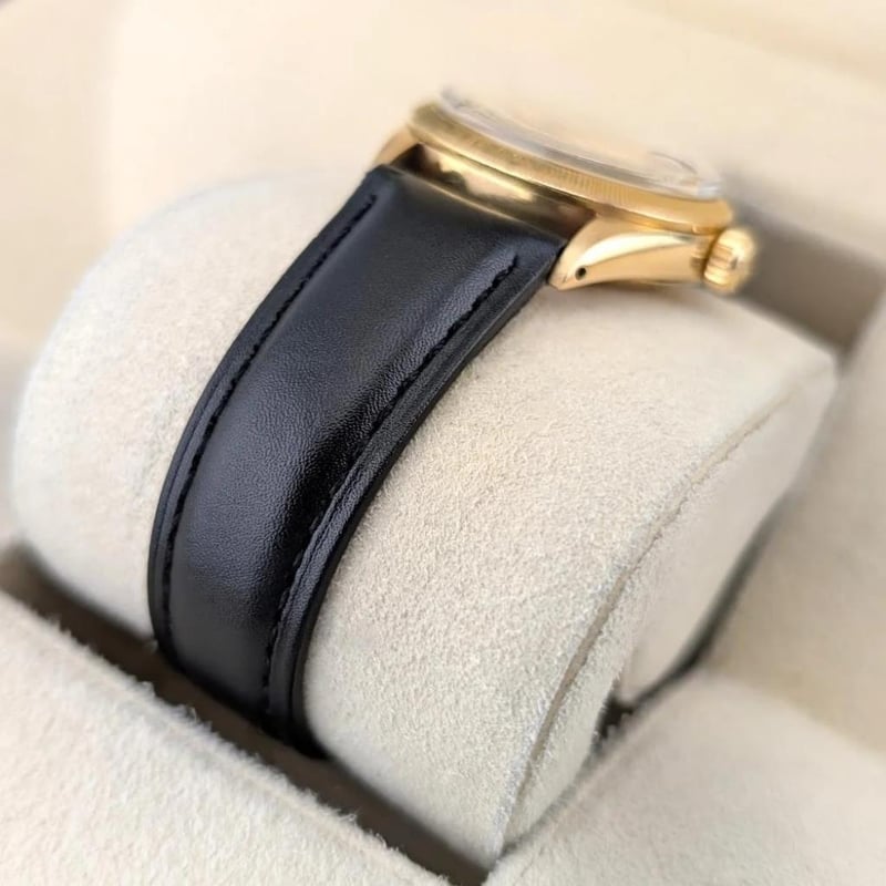 On Aftermarket Black Leather Strap With Stainless Steel Tang Buckle. Slight Patina/Age-Spotting On Dial.