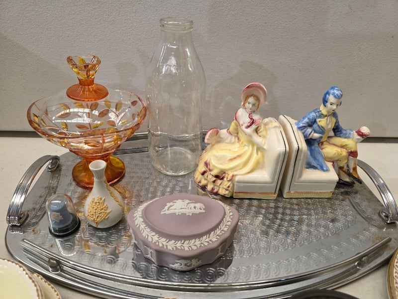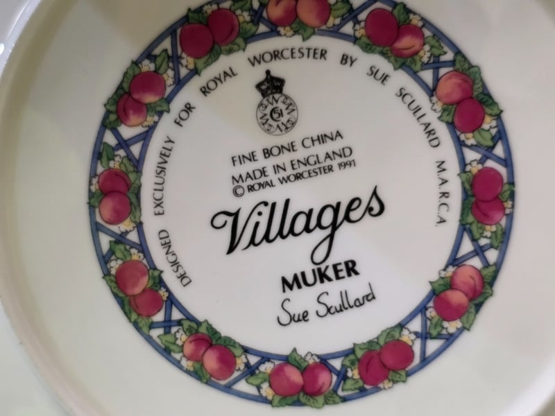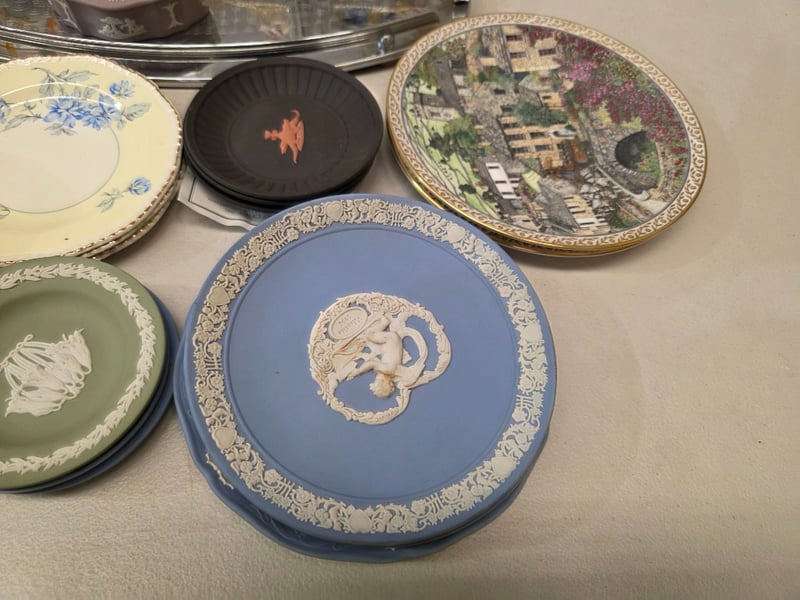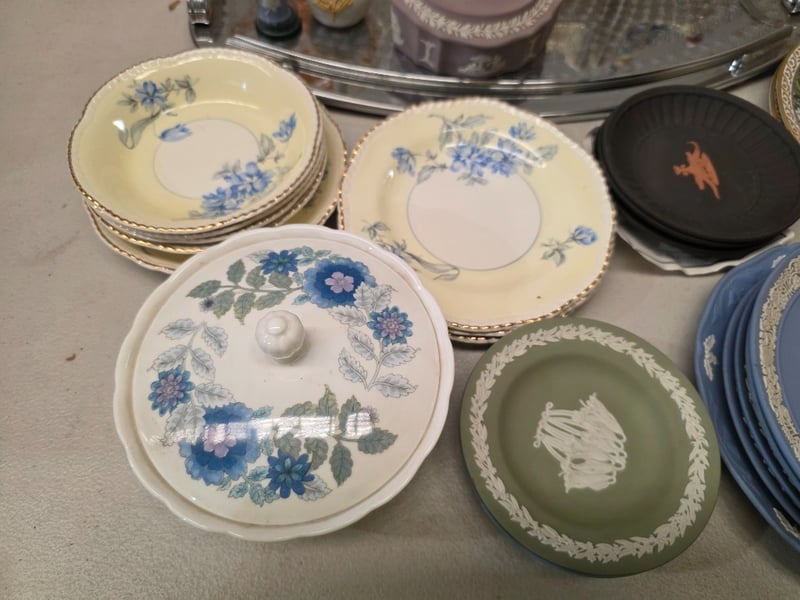 Collection Of English Bone China Tableware And Decorative Pieces Including Wedgwood Clementine Pattern Plates And Serving Dishes, Royal Worcester Villages Pattern By Sue Scullard, Jasperware Cameo Plates In Sage Green And Periwinkle Blue With Classical Relief Decoration, Hand-Painted Floral Dinner Plates And More