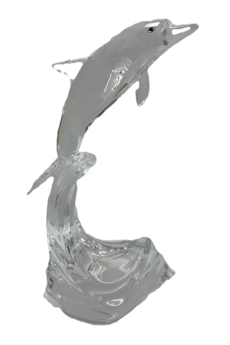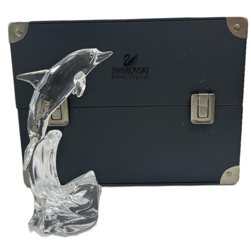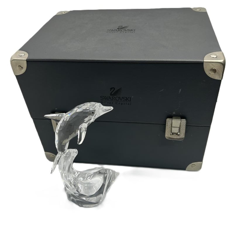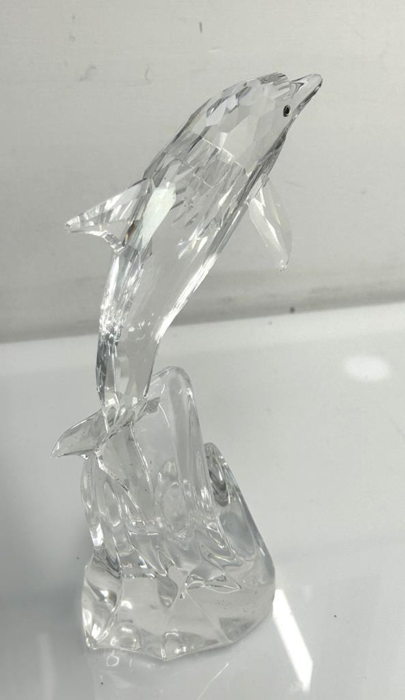 Finely Cut Clear Crystal Dolphin Leaping Over Wave Base With Faceted Detailing, Part Of The Swarovski Silver Crystal Collection, Presented With Original Display Case And Booklet, Measures Approx. 21 X 15Cm. Condition: Pre-Owned With Light Surface Wear To Crystal, No Chips Or Cracks, Display Box Shows Heavy Interior Deterioration And Wear, Overall Good Display Condition.